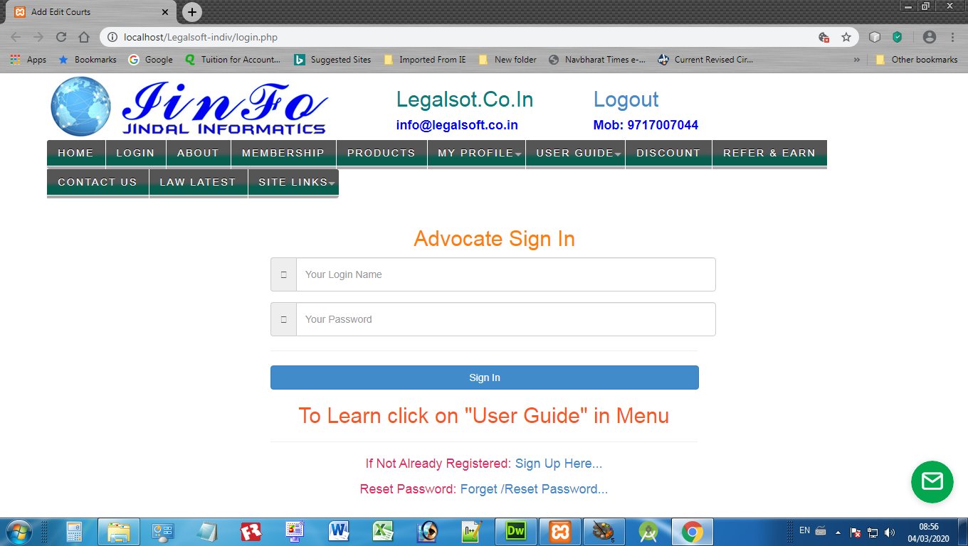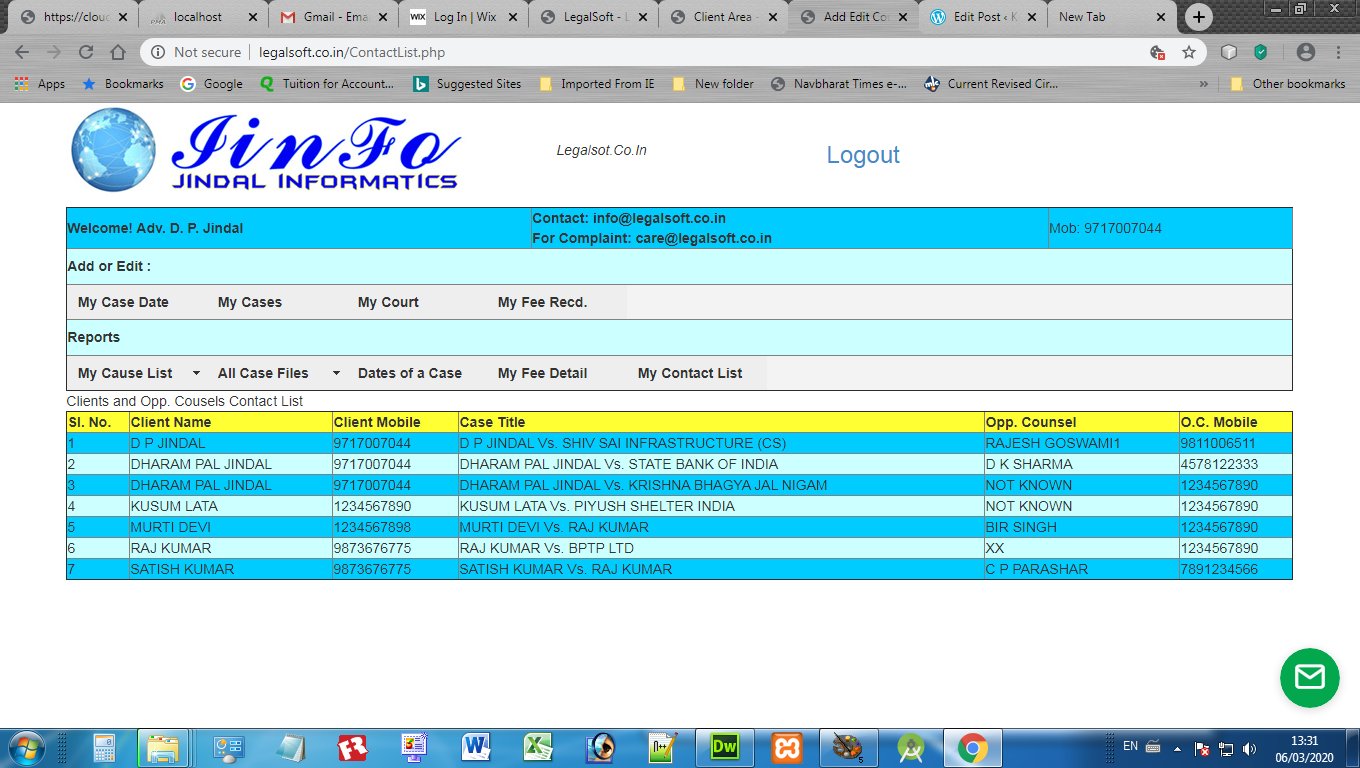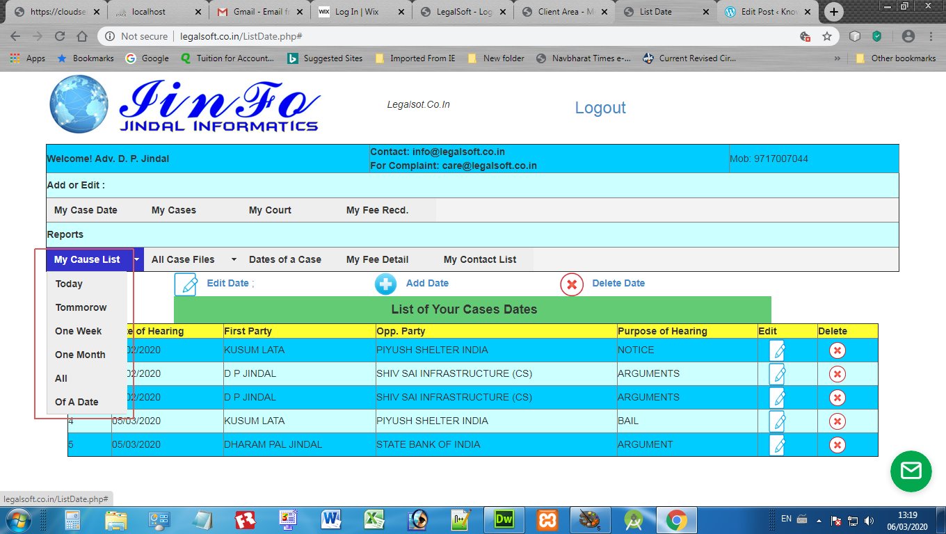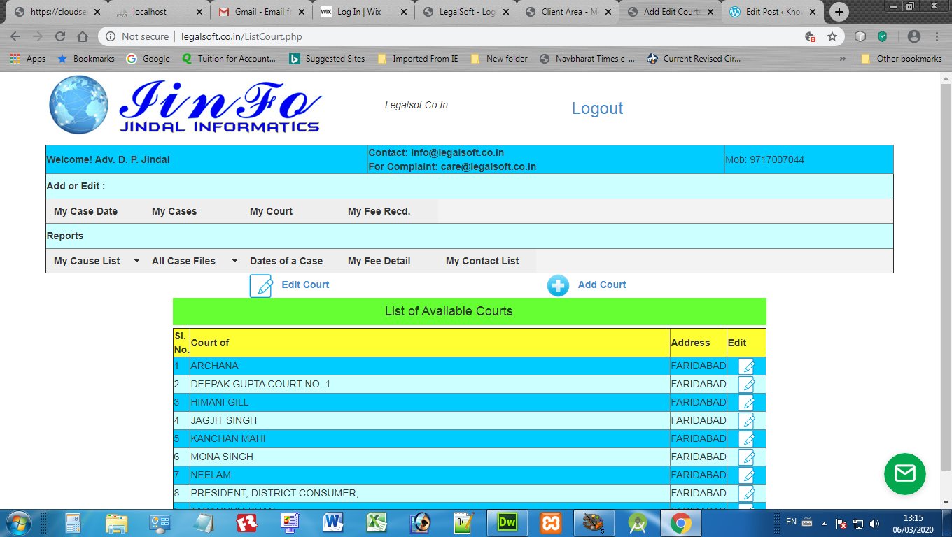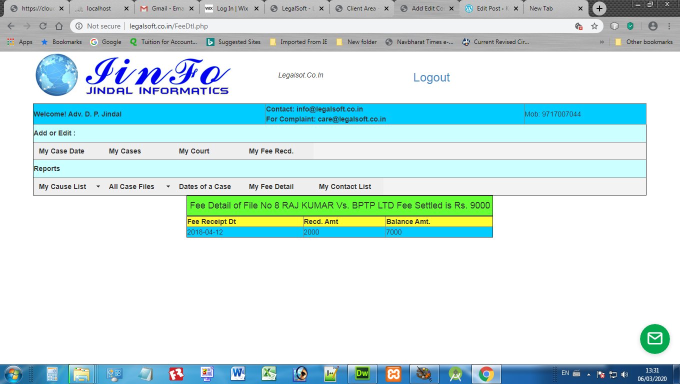 Advocates may register and login at adv-diary.jiinfo.in to maintain their daily case diary online and on smartphone. It is very simple and convenient to record the Client Data, Case Data, Courts, Case Dates and Fee record of every case. Here are some images to to have a glimpse: